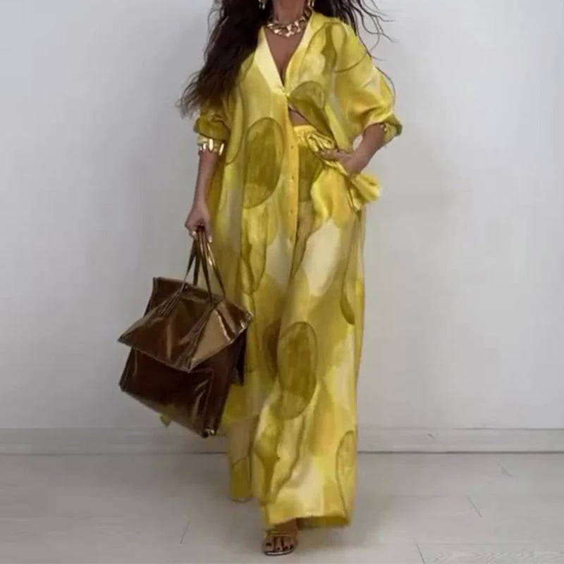 🌤️🌤️Fashionable 2-piece set with print: long-sleeved blouse and wide-leg trousers