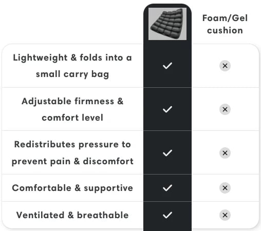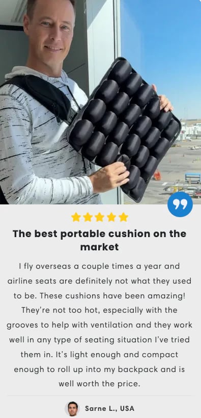 Many customers have reported significant relief from pain and discomfort when using the travel cushion when traveling. The 64 Air Cells helps redistribute pressure and gently hugs and supports your bottom, providing relief from any pain and discomfort.